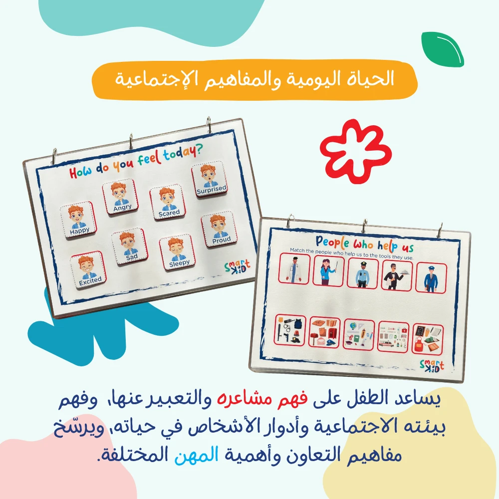 أنشطة تساعد الطفل على التعبير عن نفسه مثل كتابة اسمه، والتعرف على مشاعره من خلال “How do I feel today?”. - المعرفة العامة والبيئية: