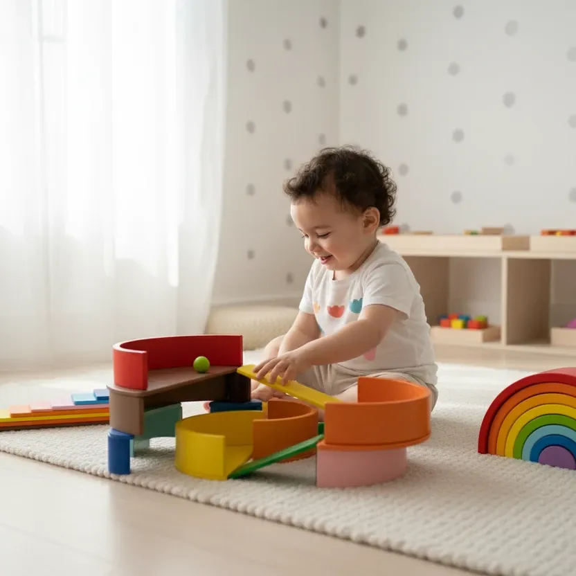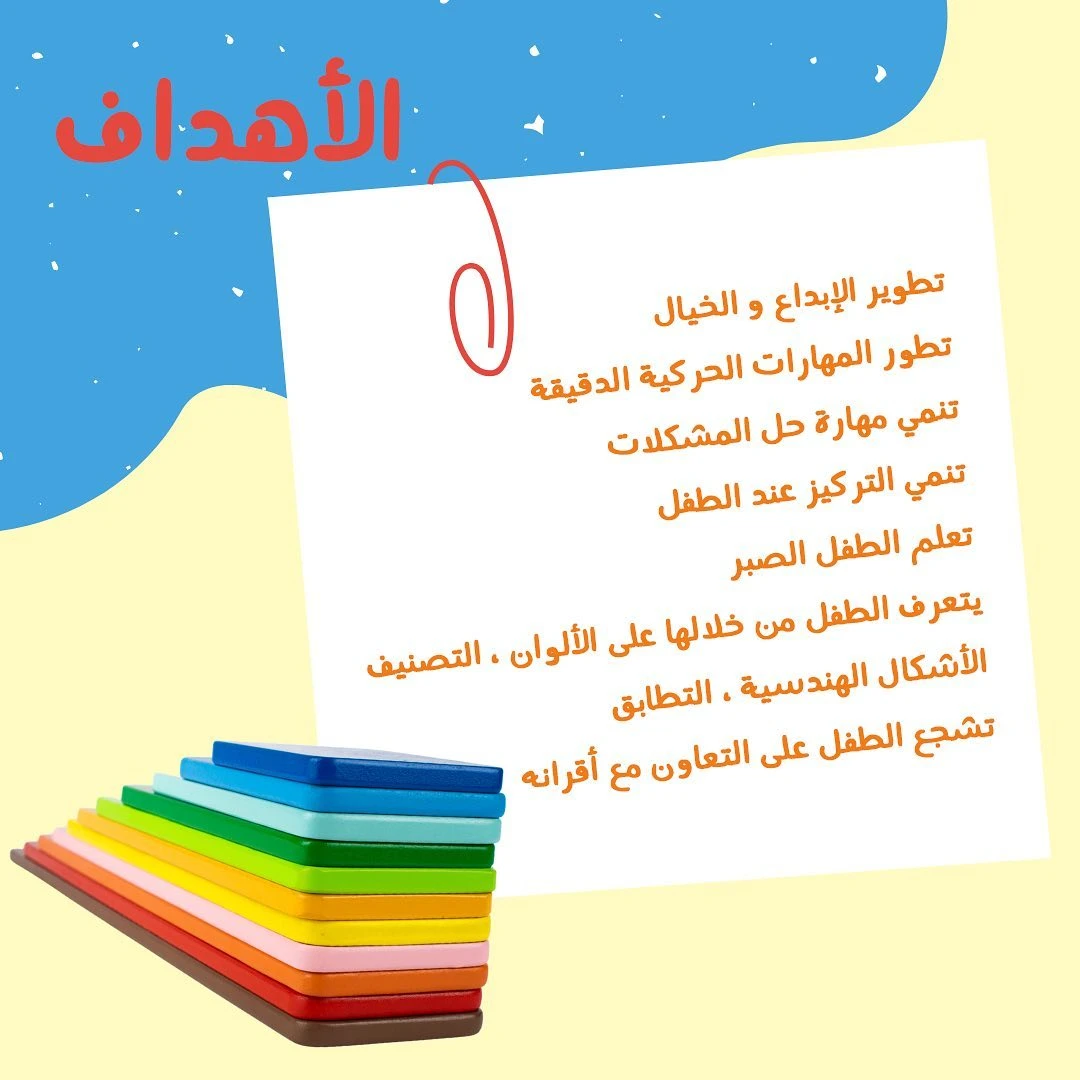 تتكوّن من ٣ ألعاب خشبية ملوّنة يمكن استخدامها معًا أو بشكل منفصل لتصميم أشكال وتراكيب لا حصر لها، وتشجّع الطفل على الابتكار واللعب الحرّ بعيدًا عن الشاشات 🌿