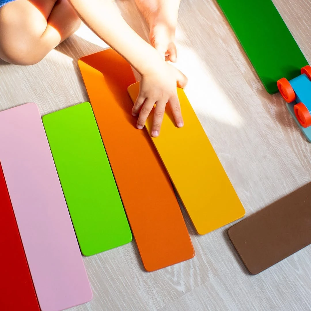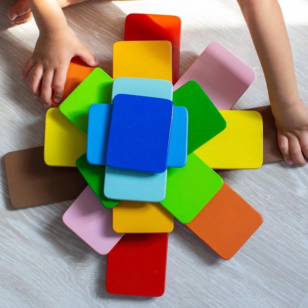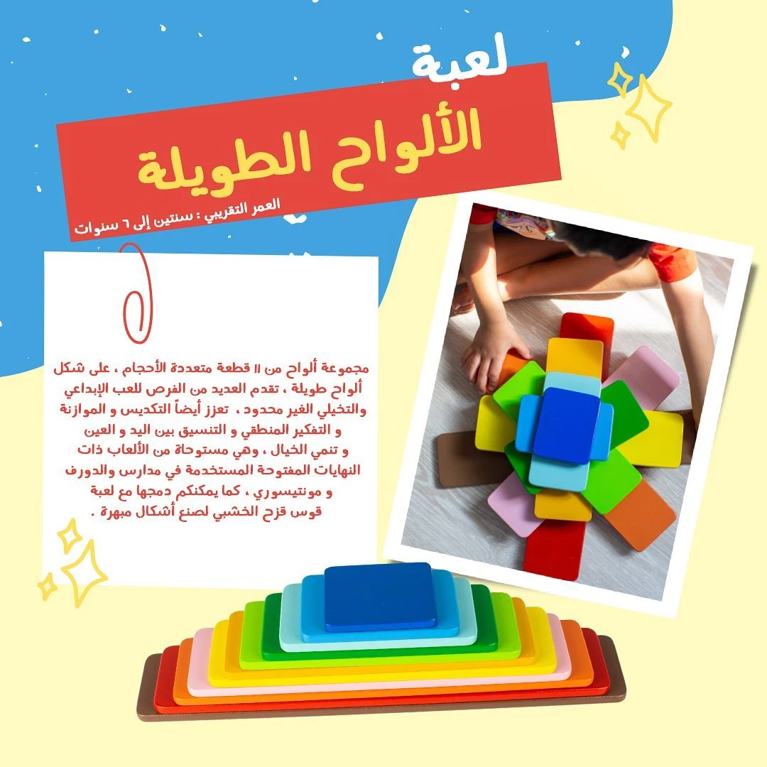 ألواح خشبية مستطيلة بألوان زاهية وأحجام مختلفة، تمنح طفلك حرية البناء والتصميم.