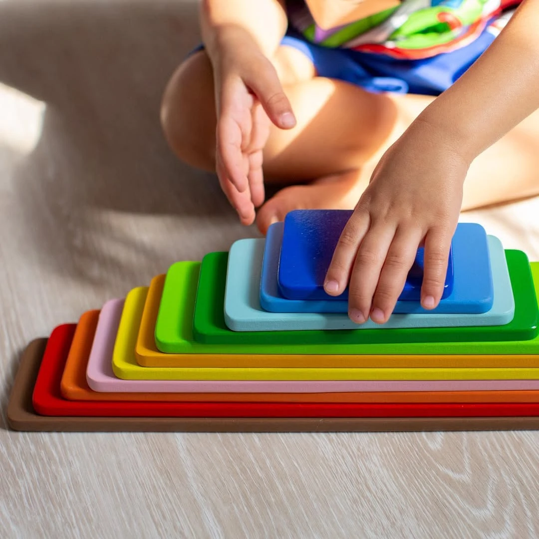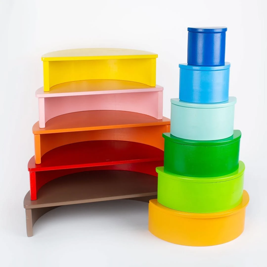 قوس خشبي ملوّن بدرجات متناسقة يساعد الطفل على فهم الأحجام والتوازن.